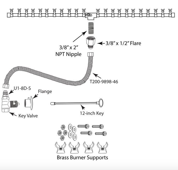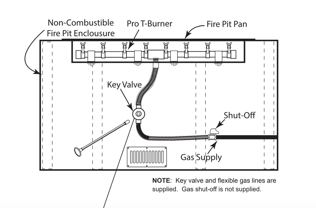 FireGear Pro Series Brass Linear T Burner For Fire Pit - Kit With Key Valve & Gas Line